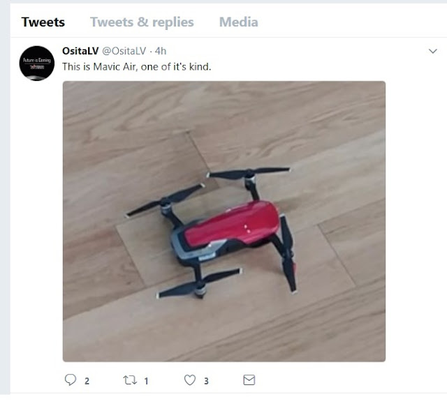 Un segreto durato quasi fino all'ultimo quello del nuovo drone DJI Mavic Air. A solo un giorno dalla presentazione che avverrà domani alle 16 ore italiane (diretta streaming su:  LIVE.DJI.COM ) è apparsa la prima foto non ufficiale del nuovo drone pieghevole DJI. E' stata rilanciata su twitter da OsitaLV un "rumorista" che in passato è risultato credibile su molte anticipazioni DJI. A prima vista il Mavic Air sembra più piccolo del Mavic Pro e più grande dello Spark, posizionandosi tra i due. Il drone ritratto non sembra essere un modello in circolazione, tipo le repliche cinesi del Mavic Pro, quindi l'attribuzione al Mavic Air appare veritiera.